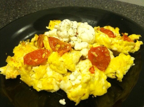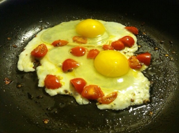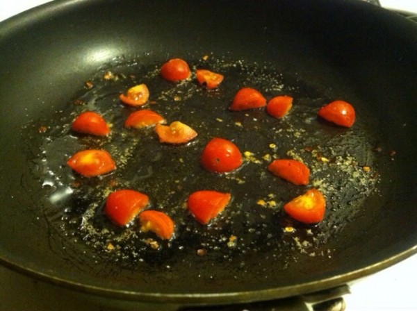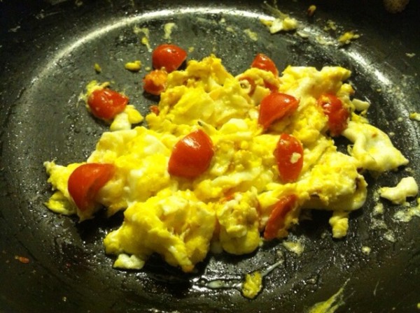 Slice the cherry tomatoes into halves or quarters (depending on how big you’d like them in your scramble) and toss them in the saucepan with the heat on low. Once the tomatoes have simmered for a few minutes and are starting to slightly wrinkle, you can add your two eggs to the pan.