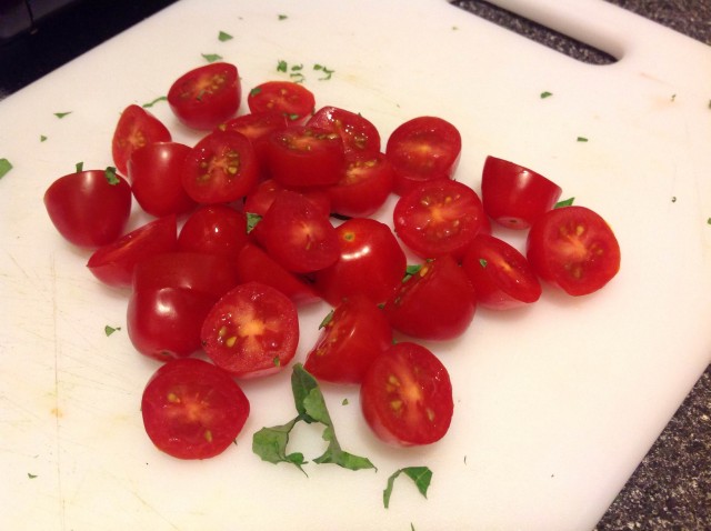 Next, I grabbed a small container of cherry tomatoes and cut them in half so they were all the same size. Add as many as you’d like to the dish. These will mostly keep their shape after baking, but cooked down slightly.