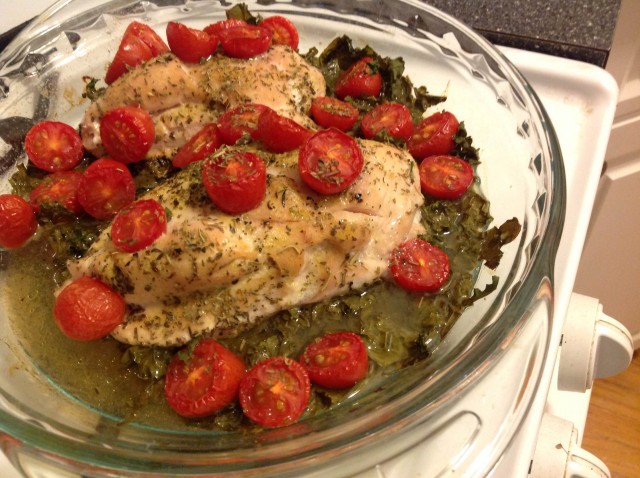 The finished product from right out of the oven is pictured above! The kale cooked down a ton from what was originally in the dish and had a great white wine and lemon freshness to it. Paired with the baked tomatoes and chicken, this was a great meal that I would definitely make again.