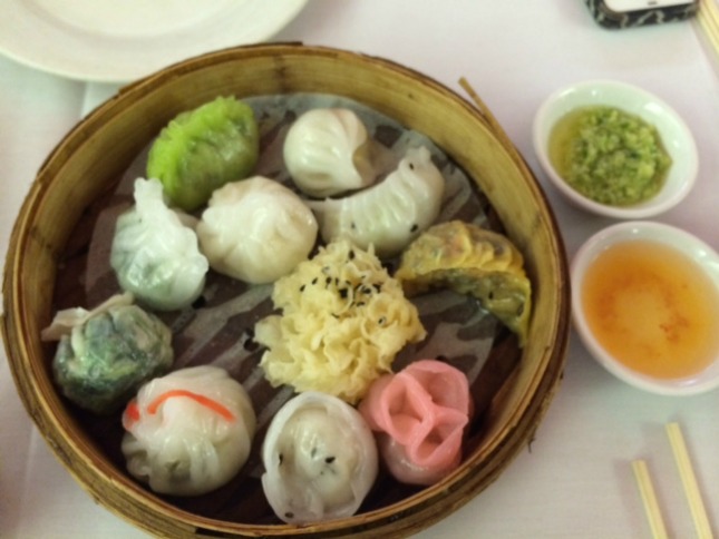 We went with the Seafood dumplings (white), Crabmeat dumplings (green) and the Vegetarian Dim Sum platter (a rainbow of deliciousness).