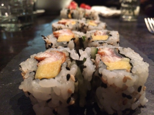To split (and mostly my main meal) we couldn’t decide between two two incredibly inviting sushi roll options, so we got both. Obviously. Our first pick was the Nagoya Roll with unagi eel, cucumber and tamago egg omelet, with crunch and eel sauce. The egg was a nice addition and paired well with the eel sauce.