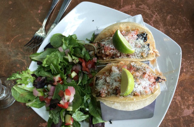 Mom’s lunch selection was the Mahi tacos (which can also be served as shrimp tacos) that included charred tomatillo sauce, pico de gallo, slaw and cotija cheese with a nice side salad and lime. Fresh and tasty, these are a great light lunch choice.