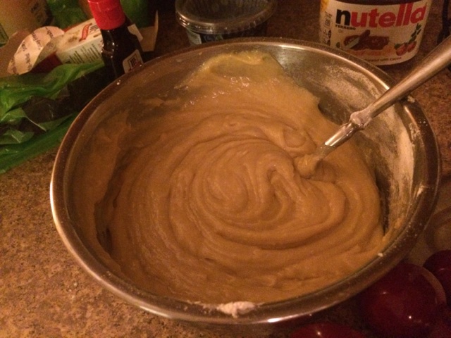 Now the fun part. Take spoon sized globs of Nutella, as much or as little as you’d like, and plop on top of the batter.