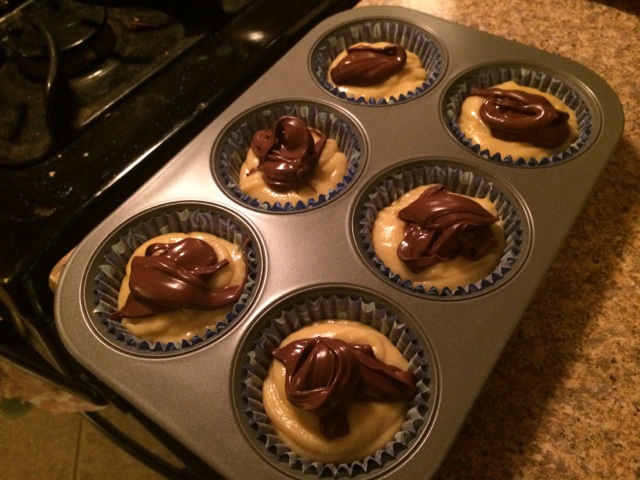 Once smooth, spoon the mixture into a muffin tin (I used baking cups for less mess). These will rise, so leave some room at the top to add Nutella before baking. Filling each cup about halfway with batter should do. I added a bit more to make them large & in charge.