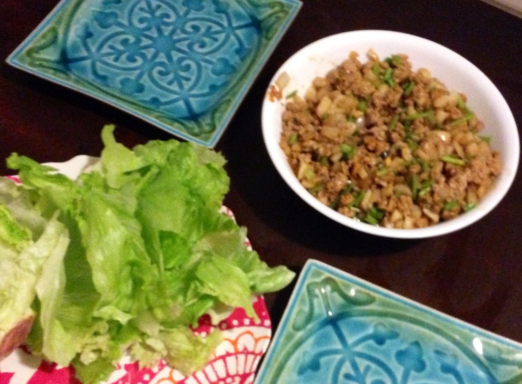 Overall, the lettuce wraps were easy to make, delicious and pretty healthy. For the recipe, I used ground chicken, which is less fatty and less calories than ground beef (a traditional taco favorite). Browned that in a pan, added chopped ginger, onions and garlic. I then added hoisin sauce, soy sauce, rice vinegar, and sriracha sauce. Combined the ingredients and garnished with scallions and water chestnuts.