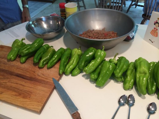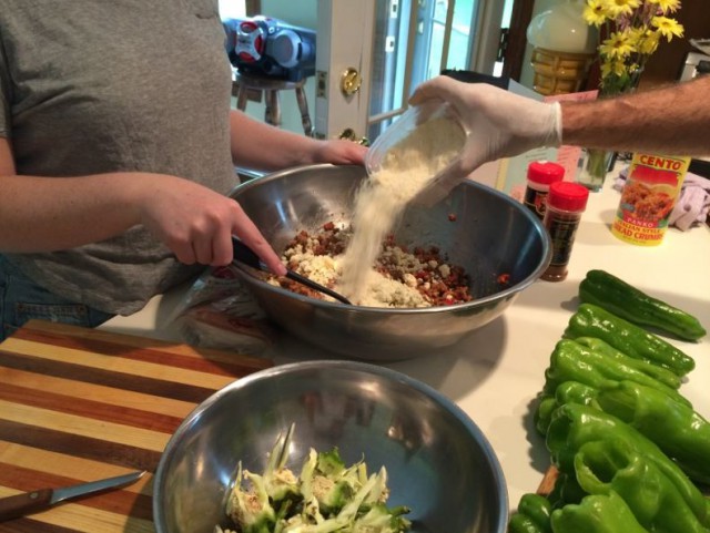 Once the mixture is set, you will be stuffing the peppers by hand. Our trick, to have one hand in a disposable plastic glove (to grab the stuffing) and the other free hand to hold the peppers.