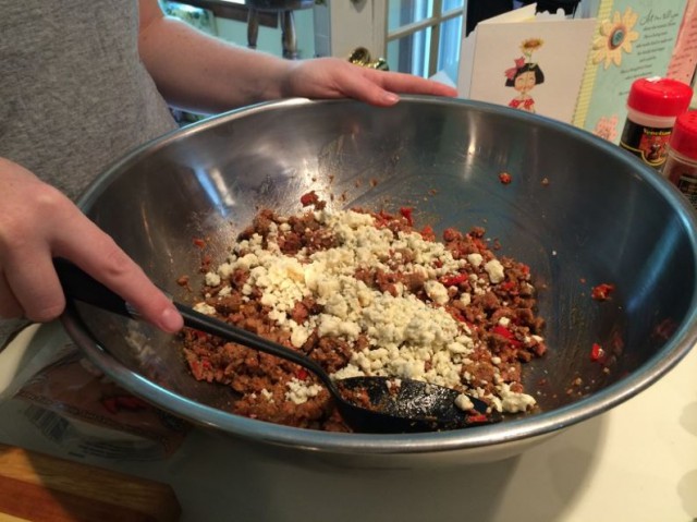 Combine the remainder of the ingredients into a large mixing bowl (Parmesan cheese, bread crumbs, red pepper, feta cheese, mozzarella cheese, dry rub spice, black pepper, cayenne pepper, basil) and add the cooked sausage and garlic.