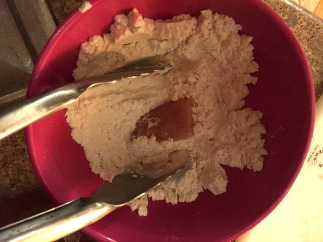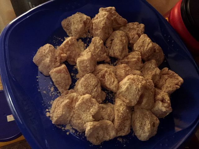 You’ll then want to fill a small bowl with the all-purpose flour with just enough to toss the pieces in to coat the outside.