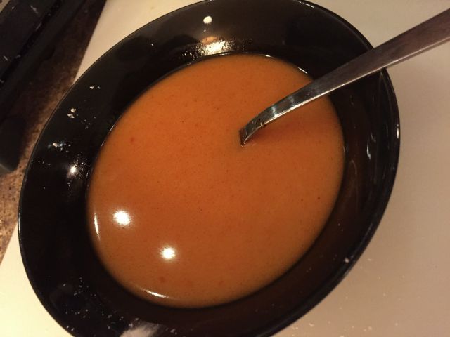 For now we’ll set aside the chicken and work on the sauce. The color will differ depending on how much hot sauce you add (if you like things with more of a kick, feel free to add more).